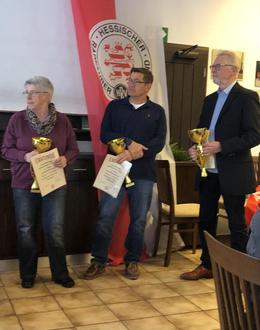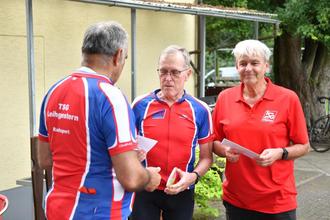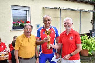 Der bei der Abteilung für die Erfassung allen Radwanderfahrten verantwortliche Meldebeauftragte Dietmar Reichel (rechts) hatten den Pokal bei einer Feier im April aus den Händen des Landesfachwart für Radwandern, Erich Kampe und dem Leiter des Radsportbezirks Lahn Dr. Peter Pagels samt Urkunde in Empfang genommen ©Foto: Thomas Wißner