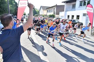 Bürgermeister Fabian Wedemann läutete die Startglocke bei den Start zum 13. Leihgesterner Volkslauf über 5 Kilometer mit 63 Teilnehmern
