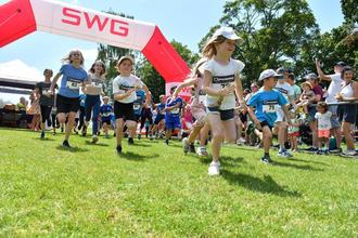 Nach einjähriger Pause gab es auch wieder Bambiniläufe für die Kinder. Hier der Start über zwei Runden der (Jahrgänge 2019 bis 2012) mit 45 Kindern