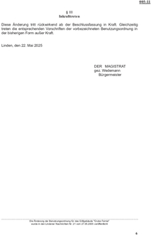 Diese Änderung tritt rückwirkend ab der Beschlussfassung in Kraft. Gleichzeitig treten die entsprechenden Vorschriften der vorbezeichneten Benutzungsordnung in der bisherigen Form außer Kraft.