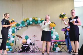 Blumen gab es zum Abpfiff von Schulleiterin Myriam Hövel (Mitte) für die beiden Moderatorinnen Joelle Ruderisch (rechts) und Evita Brüß (links) ©Fotos: Thomas Wißner