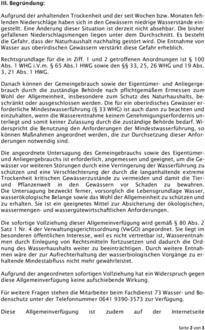 Die angeordnete Untersagung des Gemeingebrauchs sowie des Eigentümerund Anliegergebrauchs ist erforderlich, angemessen und geeignet, um die Gewässer vor weiteren Störungen durch eine Verringerung der Wasserführung zu schützen und eine Verschlechterung der durch die langanhaltende extreme Trockenheit kritischen Gewässerzustände zu vermeiden und damit die Tier- und Pflanzenwelt in den Gewässern vor Schaden zu bewahren.