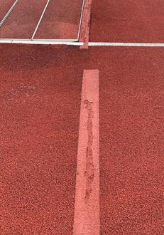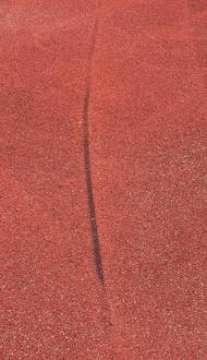 Fahrräder, Mofa, Roller und Scooter sind auf dem Gelände der Sportanlage verboten. Hier sind eindeutigen Bremsspuren in dem Tartanbelag zusehen.