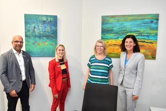 Alle Bilder eint, sie haben keinen Titel (v.l.) Filialleiter Michael Weber, Kezia Schmidt, Elke Kurz und Ilona Roth. ©Fotos: Thomas Wißner