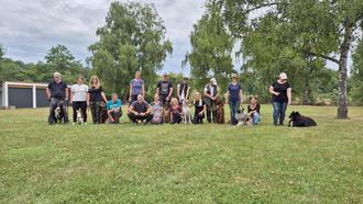 Roland Kurz mit Berner Sennenhund Theo, Mara Gerspacher mit Mini Aussie Nala, Carmen Engel mit Labrador Retriever Lucky Hunter of Kingswood, Eberhard Schmitt, Marie Westphal mit Deutscher Schäferhund Raica von der Schneiderei, Stefan Eickeler, Heike Eickeler, Axel Schmidt Malinois Malimaniac's Germania (Gia), Carmen Happ, Emma Hübers mit Slowenischer Rauhbart Fearless Hunter Bourbon Vanilla (Skardi), Tanja Lutz, Lisi Hlawaty mit Irish Setter Emilio vom Gut Deisterland, Eva Läufer mit Wolfsspitz Enja, Simone Stoermer, Daniela Weber mit Eurasier Timmi. Es fehlt Michael Müller. ©Fotos: Thomas Wißner