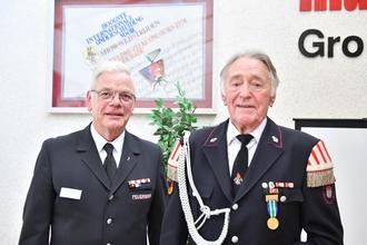 Rauber-Wagner (links) zeichnete im Auftrag des Internationalen Musikbund CISM mit Alfred Peppmöller (rechts) eine verlässliche Stütze der Großen-Lindener Feuerwehrmusik, der immer Vorbild für die jungen Mitglieder war in Anbetracht der geleisteten vorzüglichen Dienste“ mit der Goldenen Verdienstnadel aus. ©Fotos: Thomas Wißner