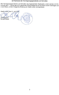 Die Vermögensgegenstände und Schulden des Eigenbetriebs Stadtwerke Linden werden mit Wirkung ab dem 1. Januar des in § 2 genannten Wirtschaftsjahres auf die Stadt Linden übertragen und in der Bilanz und der Anlagenbuchhaltung der Stadt Linden nachgewiesen.