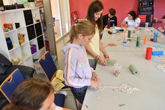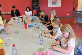 Gemeinsam mit Marina, Noah und Marlene vom Suchthilfezentrum Gießen bastelten elf Ferienkinder Traumfänger. ©Fotos: Thomas Wißner