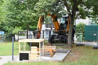 Mitarbeiter des städtischen Bauhofs schafften mit einem Arbeitseinsatz vor dem Rathaus die Voraussetzung für ein neues Spielgerät für die Kinderkrippe „Die Krabbel-Käfer“. ©Foto: Thomas Wißner