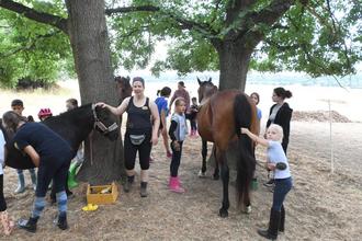 Erneut tauchten elf Ferienkinder von Montag bis Mittwoch auf der Hofreite Hänel in Leihgestern in die „Erlebniswelt Pferd“ ein. Die vier Pferde Pascha, Saphira, Ricardo und Djamilia standen im Mittelpunkt als Anna Bausch mit drei Helferinnen den Ferienkindern die Pferde und den Umgang mit diesen vorstellte. Auch diesmal wurden Grundkenntnisse zum Verhalten, Weidepflege, Putzen, Satteln und Reiten vermittelt.