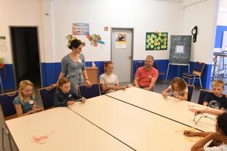 In den Jugendräumen im Erlebnispark wurden am Dienstag Traumfänger gebastelt. Jugendpflegerin Alexandra Agel hatte dabei Unterstützung durch WErzieher Tobias Bringmann wie auch mit Marlene und Marlina von zwei Mitarbeiterinnen der Fachstelle für Suchtprävention des SuchtHilfeZentrum Gießen. ©Fotos: Thomas Wißner