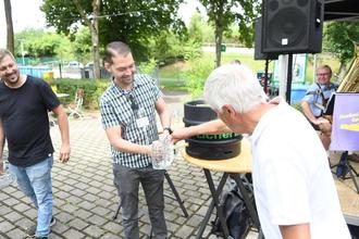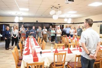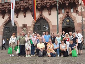 Zum Stadtfest konnte Bürgermeister Fabian Wedemann gemeinsam mit dem Vorsitzenden des Partnerschaftsverein Wolfgang Hoth im Sitzungssaal der Lindener Ratsstuben 14 Gäste aus der französischen Partnerstadt Macheren begrüßen. Angeführt wurde die Delegation des Vereins Macheren ohne Grenzen vom Vorsitzenden Dominique Schmidt. Nach dem gemeinsamen Begrüßungsessen in den Ratsstuben ging es dann am Freitag zum Stadtfest. Am Samstag unternahm die Gruppe aus Macheren gemeinsam mit Vorstandsmitgliedern des Partnerschaftsvereins wie auch Bürgermeister Wedemann und den beiden Stadträten Petra Braun und Tim-Ole Steinberg einen Ausflug mit der Bahn nach Frankfurt. In der Mainmetropole gab es eine Stadtführung "Die neue Altstadt - Rotes Haus, Goldene Waage und der Hühnermarkt", der sich dann ein Stadtbummel anschloß. Am Abend wurde der Auftritt der Tom Pfeiffer-Band auf dem Stadtfest besucht, wo die Gruppe dann am Sonntag auch den ökumenischen Gottesdienst und den anschließenden Frühschoppen besuchte. Bei diesem assistierte Schmidt Wedemann beim Faßbieranstich und eröffnete gemeinsam mit dem Stadtoberhaupt und Stadtfestwirt Sascha Homfeld den Frühschoppen.