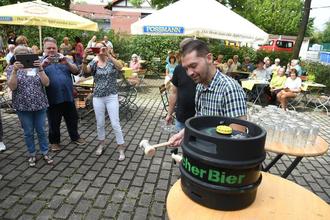 eröffnete Bürgermeister Fabian Wedemann bei seinem ersten Faßbieranstich mit drei Schlägen den Frühschoppen