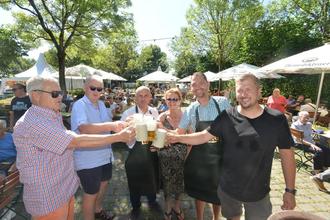 wie auch die Präsidentin von Macheren ohne Grenzen, Sabine Dome (3. von rechts) und Sosnicowices Bürgermeister (3. von links) am Faßbieranstich mit. ©Fotos: Thomas Wißner