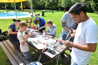 Im Freibad war eine Kreativwerkstatt „Wir bauen SolarCup Boote“ aufgebaut wo Jugendpfleger Michale Wagner und Klimaschutzmanager David Stadermann mit zehn Ferienkindern SolarCup Boote bauten.