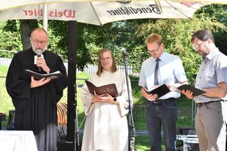 Mit einem von (v.l.) Pfarrer Edwin Tonn, Pastroalreferentin Kerstin Rehberg-Schroth, Gemeisnchaftspastor Martin Grebe und Prädikant Jürgen Schneider gehaltenen Ökumensichen Stadtfestgotetsdienst