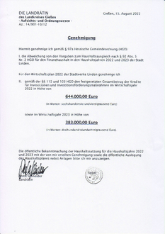 Der Haushaltsplan und der Wirtschaftsplan liegen in der Zeit vom 29.08.2022 bis 07.09.2022 in der Stadtverwaltung Linden, Konrad-Adenauer-Straße 25, Zimmer 303, während der üblichen Sprechzeiten öffentlich aus.