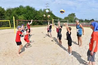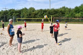 Zehn Ferienkinder waren am Dienstag beim Anfängerkurs für Beachvolleyball dabei und lernten bei Peter und Matthias und herrlichem Sonnenschein die beliebte Sportart kennen.