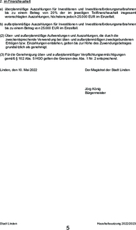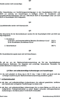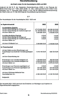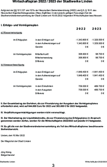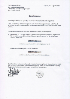 Der Haushaltsplan und der Wirtschaftsplan liegen in der Zeit vom 05.09.2022 bis 14.09.2022 in der Stadtverwaltung Linden, Konrad-Adenauer-Straße 25, Zimmer 303, während der üblichen Sprechzeiten öffentlich aus.