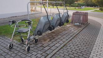 Fotos können auch manchmal trügerisch sein. Nein, es ist kein neues städtisches Angebot wie es unser Foto vom Leihgesterner Friedhof vermuten läßt. Zwar können weiterhin bei einem Friedhofbesuch Wagen zur Beförderung von Grabschmuck und Erde ausgeliehen werden, doch erweitert wurde dieses Angebot um Rollatoren nicht. Bereits seit zwei Wochen steht dieser Rollator bei den Leihwagen, doch zur Ausleihe beim Friedhofbesuch ist er nicht. ©Foto: Thomas Wißner