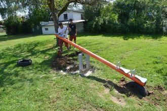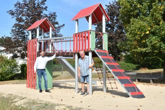 stellten Bürgermeister Fabian Wedemann (links) und Bauhofleiter Jens Wolfram (rechts) die neue Spiel-Kletter-Kombination zum Abschluß der Gesamtmaßnahme vor. ©Fotos: Thomas Wißner