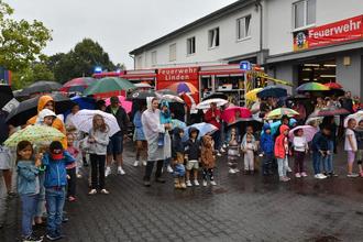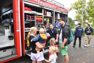 Auch der Regen konnte die zufriedene Bilanz des „Tag der offenen Tür“ der Freiwilligen Feuerwehr Großen-Linden nicht trüben. Trotz des nach Mittag einsetzenden Regens zeigten sich Wehrführer Dennis Braun und der Vorsitzende des Feuerwehrvereins Kai Hilberg zufrieden, dass alles gut verlaufen und die Resonanz Top war. Den Besuchern wurde nicht nur ein Blick hinter die Kulissen sondern auch ein vielfältiges Aktionsprogramm samt Fahrzeugaustellung und bester Verköstigung geboten. Aufgrund der Wettervoraussage kurzfristig umdisponiert und der vorgesehene Biergarten nicht aufgebaut, sondern die Tische und Bänke in der Fahrzeughalle aufgestellt. Musikalisch eröffnete das Jugendmusikcorps unter der Leitung von Philipp Maurer das Programm gefolgt von den Nachwuchsbrandschützern die einen Lagerfeuerbrand löschten. Für die Kinder gab es ein Spiel- und Spaßangebot.