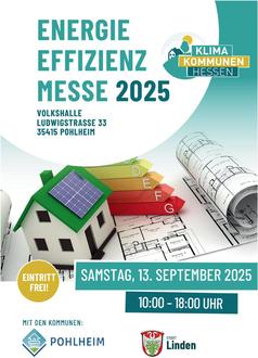 Die Städte Pohlheim und Linden veranstalten eine Energieeffizienzmesse am Samstag, 13. September, von 10 bis 18 Uhr in der Ludwigstraße 33 Volkshalle in Watzenborn-Steinberg. Bürgerinnen und Bürger haben die Möglichkeit, sich umfassend zu den Themen Erneuerbare Energien, energieeffizientes Bauen und Sanieren sowie Förderangebote und Klimaanpassungsmaßnahmen im Zusammenhang mit Privatgebäuden und Haushalten zu informieren.