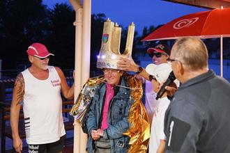 Eine Krone für die "Freibad-Queen" Jutta Arndold die zudem noch eien Flasche "Lindener Schwimmbad-Wasser" von den Bademeistern (v.l.) Andreas Bahn, Thomas Peter Fuchs, Maximilian Scheer und Dirk Heil erhielt