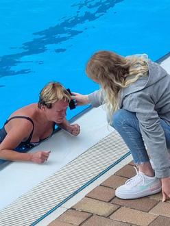 Einen solchen Telefonservice für eine Freibad.-Queen bietet nur das Lindener Freibad: Kassiererin Finja Schmidt leistet bei Jutta Arnold Telefonservice