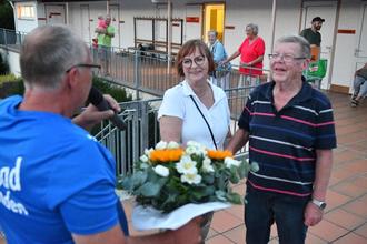 Blumen gab es für den einstigen Rekordbesucher Hartmut Boller aus Langgöns, der „sich mit seiner Gundi getraut hat“, wie Bademeister Dirk Heil bei der Überreichung und Gratulation verriet.