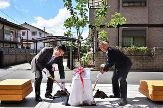 Oberbürgermeister Hideo Yoritaka (recjhts) bei der Pflanzung eines Apfelbaums vor dem Gebäude ©Fotos: Thomas Wißner