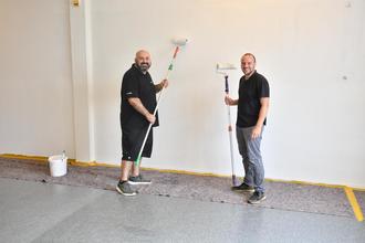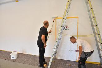 In den städtischen Jugendräumen im Erlebnispark sind in dieser Woche fleißige Mitarbeiter der Firma Tucker als Handwerker im Rahmen eines Sozialprojekts des Unternehmens mit Niederlassung im Gewerbegebiet Lückebachtal im Einsatz. Da wurden im Beisein von Jugendpfleger Christian Hertle Wände gestrichen (mehr dazu in der nächsten Ausgabe. ©Foto: Thomas Wißner