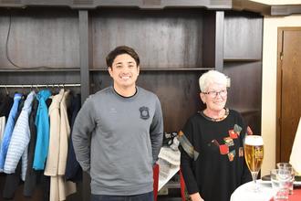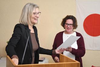 Ehrenstadträtin Pera Braun (rechts) hatte mit dem Hüttenberger Handballer Ryuga Fujita einen Überraschungs-Gast aus dem Land der aufgehenden Sonne mitgebracht