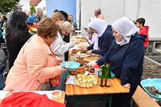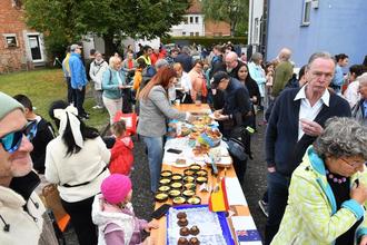 Riesenandrang im Hof des Evangelischen Gemeindehaus in Leihgestern, wo am vergangenen Sonntag mit „Gebackenes aus aller Welt“ nach der Großkundgebung im Mai die zweite Veranstaltung des Bündnis „Linden bleibt bunt – Nie wieder ist jetzt!“ statt. Fast 300 Besucher waren gekommen um sich zur Kaffeezeiten an einer großen Kuchentafel zu stärken, welche mit 20 Kuchen aus neun Nationen aufwartete. Angeboten wurden etwa aus dem Irak Halva Datteln, Reismilch und Italm-Möhren, Kaku-Kuchen aus Kurdistan, Halava Käse, Falavel, Katayef und Weinblätter aus Syrien, Walnuss- und auch Zitronenkuchen aus der Schweiz, Gata(Nazuk), Heriessa und Napieon aus Armenien, Piroschki mit Kirsche, Kohlkuchen, Pfannkuchen mit Käse und Apfelkuchen aus der Ukraine, Afghan Biscuit aus Neuseeland sowie Prajitei Zburati und Cusma lui Guguta aus Moldau. Nich fehlen durfte als Kuchenspezialität aus Linden Butterloch- und Streuselkuchen.