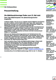Nach zwei Jahren Pause finden die Mädchenaktionstage in diesem Jahr wieder mit Übernachtung statt. Die Kosten betragen 25 Euro für Programm und Verpflegung. Das komplette Programm und der Anmeldeflyer können unter www.lkgi-jugendfoerderung.de heruntergeladen werden.