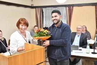 Lang übereichte zu Beginn nachträglich zum 30. Geburtstag Blumen an Meric Uludag (Die Linke)