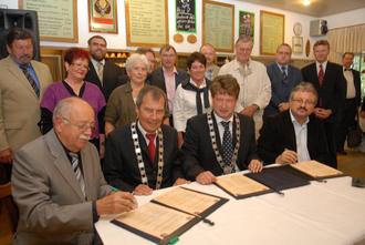 Partnerschaftsurkunden unterzeichneten im September 2009 (v.l.) Erster Stadtrat Dieter Lehr, die beiden Bürgermeister Dr. Ulrich Lenz und Frank Lange und Macherns stellvertretender Bürgermeister Robert Steinbauer ©Foto: Thomas Wißner