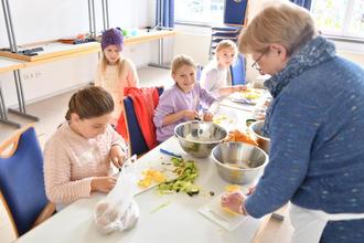 Bereits am Samstagmorgen wurde dazu in Leihgestern im Gemeindehaus mit 14 Grundschülern ein Erntedank-Gemüse-Eintopf vorbereitet