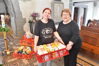 Am Montag wurden die Erntegaben, darunter 30 Kilogramm Lebensmittel, durch Küsterin Adelheid Korkesch (rechts) an Barbara Preis und die Rosenhofstiftung in Leihgestern übergeben