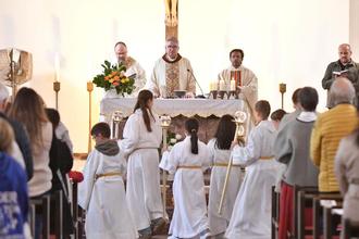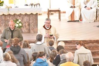 Im Rahmen der bischöflichen Visitation des Pastoralraums Gießen-Süd feierte Bischof Peter Kohlgraf am Mittwoch vergangener Woche eine Abendmesse mit den Gläubigen in der katholischen Kirche Christkönig. Der Gottesdienst wurde mitgestaltet von den 24 Erstkommunionkindern des aktuellen Kurses. „Hier ist ja richtig was los! Soooo viele!“, zeigte sich der Bischof sichtlich beeindruckt als er mit einer großen Schar Ministrantinnen und Ministranten zum festlichen Einzug in das Gotteshaus Aufstellung nahm.