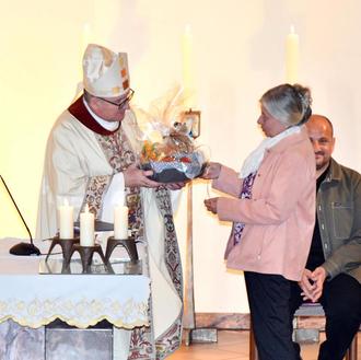 Als Vorsitzende des Pfarrgemeinderates begrüßte Angelika Richter-Seibert (rechts) Bischof Kohlgraf, dankte ihm für sein Kommen und überreichte ihm am Ende des Gottesdienst auch einen Geschenkkorb.