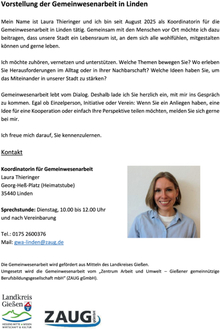 Mein Name ist Laura Thieringer und ich bin seit August 2025 als Koordinatorin für die Gemeinwesenarbeit in Linden tätig. Gemeinsam mit den Menschen vor Ort möchte ich dazu beitragen, dass unsere Stadt ein Lebensraum ist, an dem sich alle wohlfühlen, mitgestalten können und gerne leben.