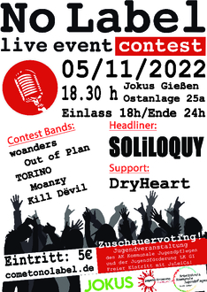 Fünf talentierte Nachwuchsbands treten am Samstag, 5. November, beim „No Label“-Live-Event-Contest des Arbeitskreises Kommunale Jugendpflegen im Landkreis Gießen auf. Von einer jugendlichen Jury aus dem Jugendzentrum in Watzenborn-Steinberg ausgewählt wurden „woanders“ (Gießen), „Out of Plan“ (Weilmünster), „Torino“ (Grünberg), „Moanzy“ (Marburg) und „Kill Dëvil“ (Wetzlar). Wie gewohnt tritt neben den Contest-Teilnehmern die Vorjahressiegerband als Opener auf: Dies sind die Experimental-Rocker „Dry Heart“ aus Gießen und Fernwald. Als Headliner außer Konkurrenz tritt die heimische Alternative-Popband „Soliloquy“ auf.