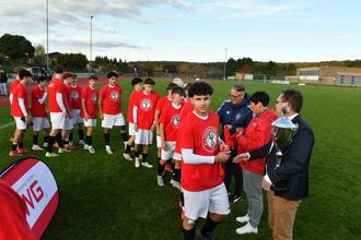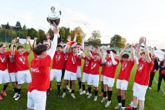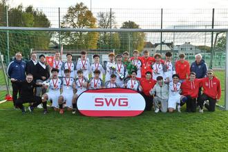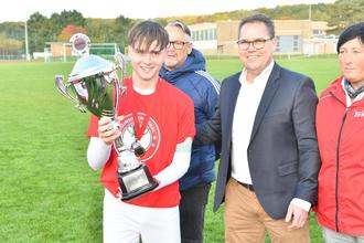 und dem Pokal für Spielführer Jakob Wehr (links) durch Stadtwerke-Marketingleiter Ulli Boos