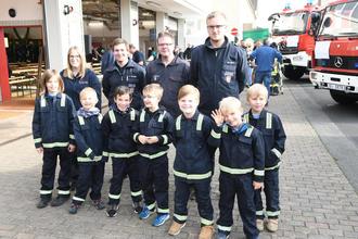 Seit 25 Jahren bebsteht die Minifeuerwehr, die (hinten von links) von Lena Moos, Kevin Bauer, Sven Meyer und Mirko Wolf betreut wird