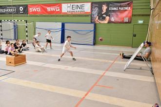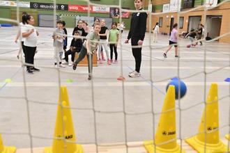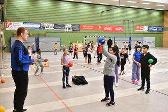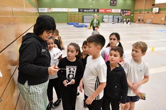 Ein voller Erfolg war die erstmalige Teilnahme der Burgschule Großen.-Linden am Handball-Grundschulaktionstag des Deutschen Handball Bundes (DHB). An diesem nahmen alle drei dritten Klassen (U9) in der Lindener Stadthalle unter dem Motto „Handball erleben und bewegen“ teil. Die Schülerinnen und Schüler konnten einen ganzen Vormittag lang den beliebten Mannschaftssport kennenlernen. Unterstützt wurde die Veranstaltung vom TV Hüttenberg, dessen Profiabteilung mit den beiden Bundesligaspielern Simon Böhne und Paul Kompenhans vertreten war. Dabei trafen sie mit dem an der Burgschule als Sportlehrer tätigen Carlos Prieto Martos auf einen ehemaligen Mannschaftskameraden, denn 2019 stand der ehemaligen spanische Nationalspieler und in die Hall of Fame of European Handball aufgenommene Martos in Diensten des TV Hüttenberg. Handball-Experten und –Akteure unter sich die den 68 Schülerinnen und Schülern schon einiges zur Faszination des Handballsports zeigen konnten. Und mit Schulsozialarbeiterin Svenja Schmidt war noch eine weitere Handball-Trainerin mit dabei, ist diese doch beim TUS 1965 Vollnkirchen aktiv. Der Verein stellte für den Grundschulaktionstag zahlreiche Bälle zur Verfügung. Nach der Begrüßung durch Schulleiterin Sabine Wagner und der Vorstellung der Profis begann der Aktionstag mit einem gemeinsamen Aufwärmen. Im Mittelpunkt stand anschließend der sogenannte Hanniball-Pass, bei dem die Kinder an fünf Stationen ihre Geschicklichkeit, Reaktionsfähigkeit und Teamarbeit unter Beweis stellen konnten.