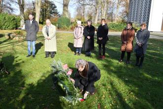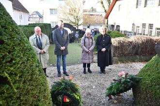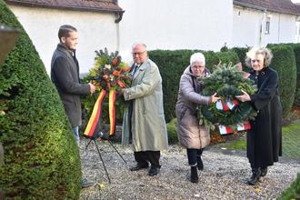 Bürgermeister Fabian Wedemann und Stadtverordnetenvorsteher Axel P. Globuschütz legten gemeinsam mit VdK-Vorsitzenden Monika David und Ehrenstadträtin Petra Braun Kränze nieder