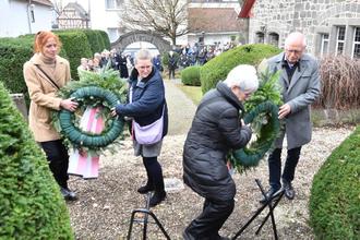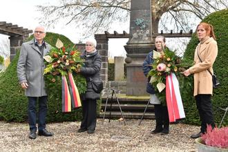 Für die Stadt legten Erster Stadtrat Harald Liebermann und Ehrenstadträtin Petra Braun und für den VdK Marina Frankenfeld und Michaela Bramer den Kranz am Ehrenmal nieder