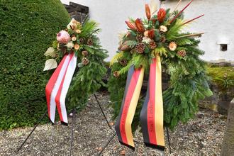 sodann die Kranzniederlegungen durch Stadt und den Sozialverband VdK stellvertretend für die Vereine und Verbände der Stadt erfolgten