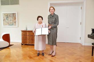 Botschafterin Petra Sigmund heftet Kozue Ueno den Verdienstorden an